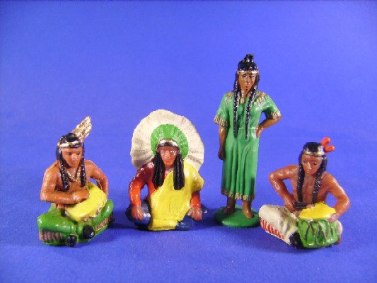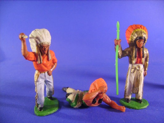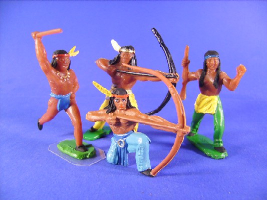 Indianer Die ersten Solids-Indianer von 1955 stammen noch aus umgearbeiteten Metallgussformen. Diese Figuren hatten auch schon steckbare Waffen. Bei der Umstellung auf Kunststoff wurden bei solchen Figuren wie dem Speerwerfer auf der Abbildung oben links die Löcher zum Einstecken der Waffen verschlossen. Statt der Steckwaffe wurde ein viel zu kurzes Stück Kunststoff mit der Figur zusammen gegossen. Es ähnelt eher einem Stock als einem Speer. |